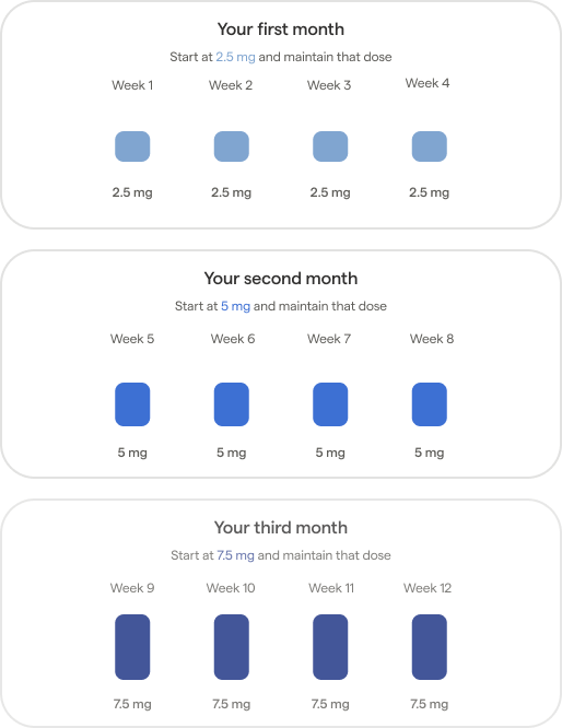If your goal is to manage diabetes and weight loss, or weight loss only, here is how your first 12 weeks will look like. The starting dose of Mounjaro is 2.5 mg per week for 4 weeks. After 4 weeks, you will increase your dose to 5mg for another 4 weeks, before increasing your dose to 7.5mg. It’s important that you do not increase your dose at a faster rate than what is outlined here. This is because the medication was designed to be increased at a specific rate for your safety and in order to minimize side effects. This allows your body time to adjust to the medication.