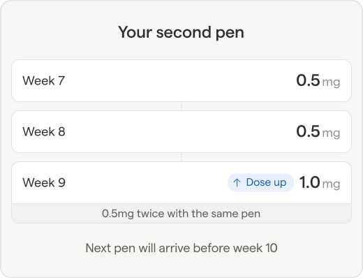 You’ll continue to maintain a dose of 1mg for these 4 weeks. During week 11, you’ll be prompted to complete a renewal to allow enough time to receive your next pen.